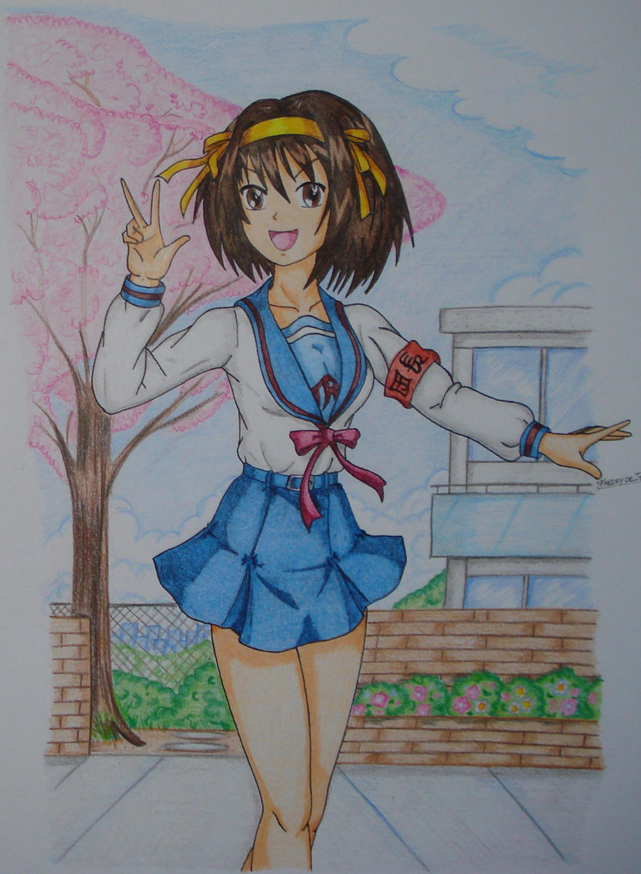 Este dibujo lo hice por una amiga de México que conocí en un foro de anime y videojuegos, y de hecho le gustaba bastante ese anime, Haruhi Suzumiya no Yutsu. Este me lo calificaron como uno de los mejores dibujos debido a su colorido tanto en el personaje como en el fondo, y la pose con mucha movilidad.