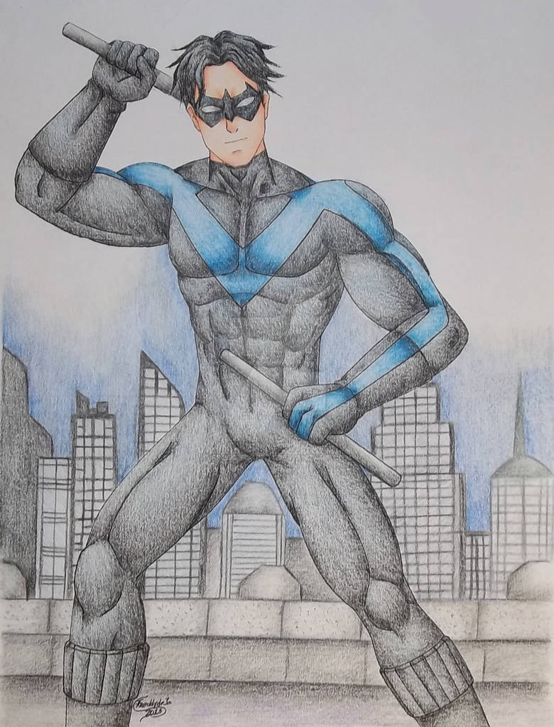 En el 2013 comenzaba con los dibujos de super héroes de cómics, en este caso con los de DC. He dibujado a varios de ellos pero este de Nightwing es el que más me ha gustado de lo que yo hice. Le he puesto mucha inspiración en el coloreado, fondo y es el que mejor proporcionado me quedó.